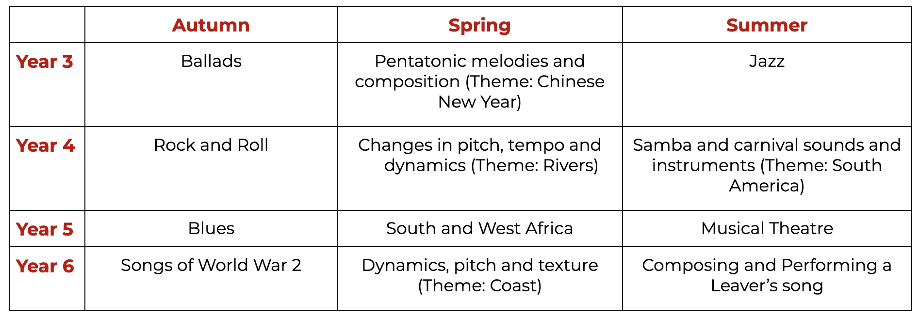 Music is taught in half-termly units, following the Kapow Primary Music Scheme progression from Year 3 to Year 6. Each unit builds on prior learning to ensure the sequential development of musical knowledge, skills, and vocabulary.